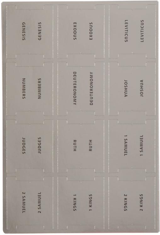 The names of the Bible books are printed in black on silver-foiled indexing tabs that will coordinate well with the silver gilt-edged pages of your Bible.