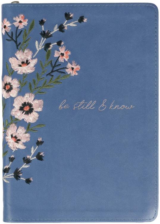 Set some time apart to journal your thoughts~ adoration~ and prayers in the Be Still Floral Embroidered Blue Faux Leather Classic Journal with Zippered Closure. The daily Scripture verses paired with the beautiful design will prompt your heart and mind to become still for a time of worship.