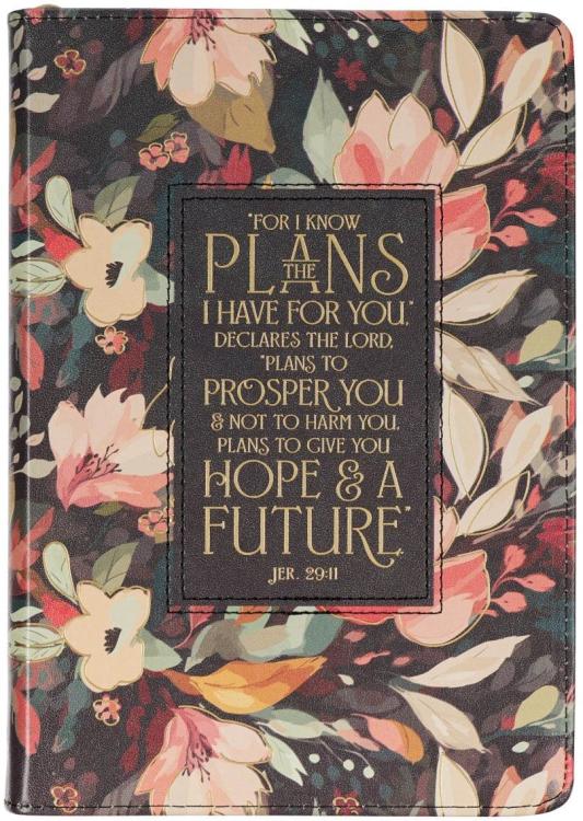 The Hope and a Future Midnight Botanical Faux Leather Journal with Zipper Closure is part of the Hope and a Future Midnight Botanical Collection, which includes a stainless steel travel tumbler with a reusable straw, a faux leather checkbook cover, a spiral journal, a zippered faux leather journal, a gift bag, a faux leather bookmark, and a faux leather Bible cover.