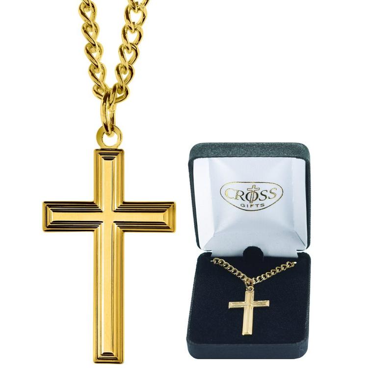 Simple and stylish, this gold cross has a handsome dimensional design. Pendant is gold plated and 1 1/8″” in length. The gold plated cable chain is 24″”. This cross necklace can be either a ladies’ or men’s gift. Comes in a deluxe black hinged presentation box.