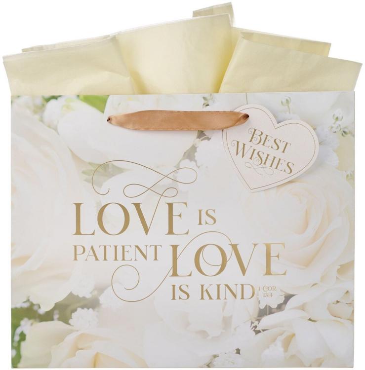 The large gift bag has a romantic white rose design that is paired with delicate baby’s breath. At its center, the iconic words from the love chapter in the Bible are displayed in shimmering gold foil lettering.
